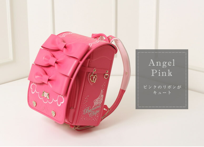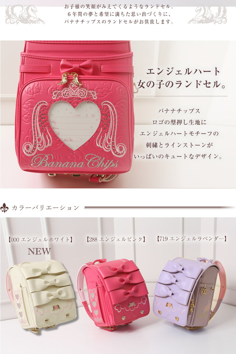 BananaChips/バナナチップス ランドセル 女の子 日本製エンジェルハート ピンク/PINK/パープル/PURPLE/ホワイト/シロ/白/WHITE/キューブ型/ウィング背カン=フィットちゃん同等/ワンタッチ錠/A4ブック(フラット)ファイルサイズ。
